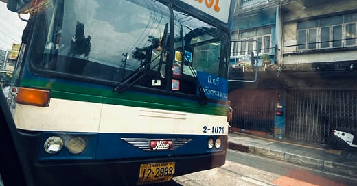 The Bangkok bus world feels fully lived in. Not explained, just known. Little details carry a lot: the dashboard Buddha, the bullet hole in the floor, the rose, the pills, Nirvana as the last stop. That kind of writing earns trust fast.