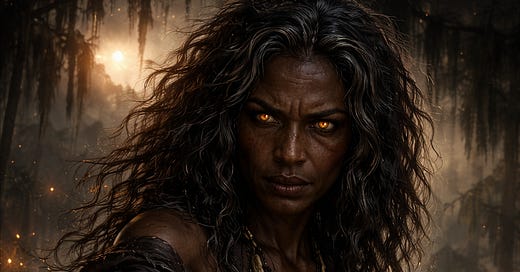 She lived where the waters smelled sweet and foul at the same time, where the cypress trees rose from the black water like old fingers, with beards of Spanish moss hanging from their branches as if the forest had left its mourning there to dry. Her house was not exactly a house. It was a wooden structure built on stilts, half shack, half wound that had learned to remain standing. Around it hung little bottles filled with mud, dried herbs, feathers, bones of small animals, pieces of mirrors, beads, and small iron bells that rang on their own whenever the damp changed too suddenly.