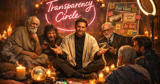 We gathered late in the evening. Low light. Cushions on the floor. Candles. Tea nobody drinks. The sort of room that says, “truth will be spoken here,” while in practice two lies, three strategic evasions, and one disgusting metaphor about the journey will be spoken.