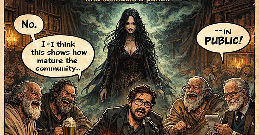 I set up a table, two microphones, low light, water I once again did not drink, and behind me a sign that read: