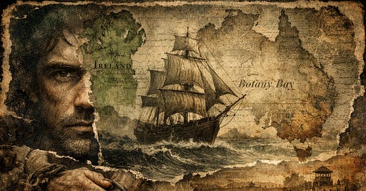 He was twenty six when they put him on the ship. The son of a tailor from the town of Loughan, just outside Derry, with eyes gray as winter water and a nose broken by a club he had taken at seventeen in a fight over pamphlets and flags. He was not a hero, however much people later like to speak that way of the dead, the imprisoned, and the exiled. He was an educated, furious young man who had learned Latin from a priest, how to sew buttons from his father, and how to hate the empire from everywhere.