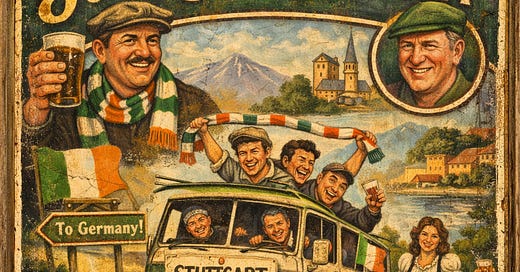 The idea of the trip began in The Harp and Wheel, a pub with a sticky floor, cloudy windows, and a toilet that smelled as though a small animal had died in it and been sainted afterward. It was early June. Outside, the air smelled of summer in the Irish way, which is to say rain not yet fully decided. Inside, the television over the bar was showing tournament analysis with the kind of solemnity that makes you wish sports journalists would all be made to build roads for a month.