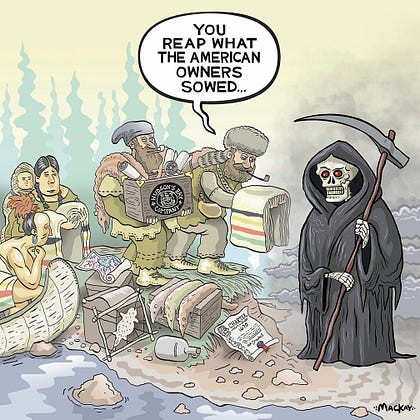 The transition of Hudson's Bay into American ownership in 2008 was a moment I captured in a cartoon, and now, with the rise of e-commerce, it faces new challenges. Although the retail landscape has changed, the history and impact of Hudson's Bay continue to resonate, reminding us of its enduring role in our national narrative.