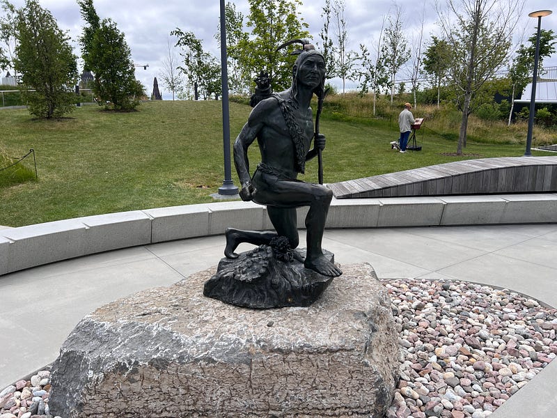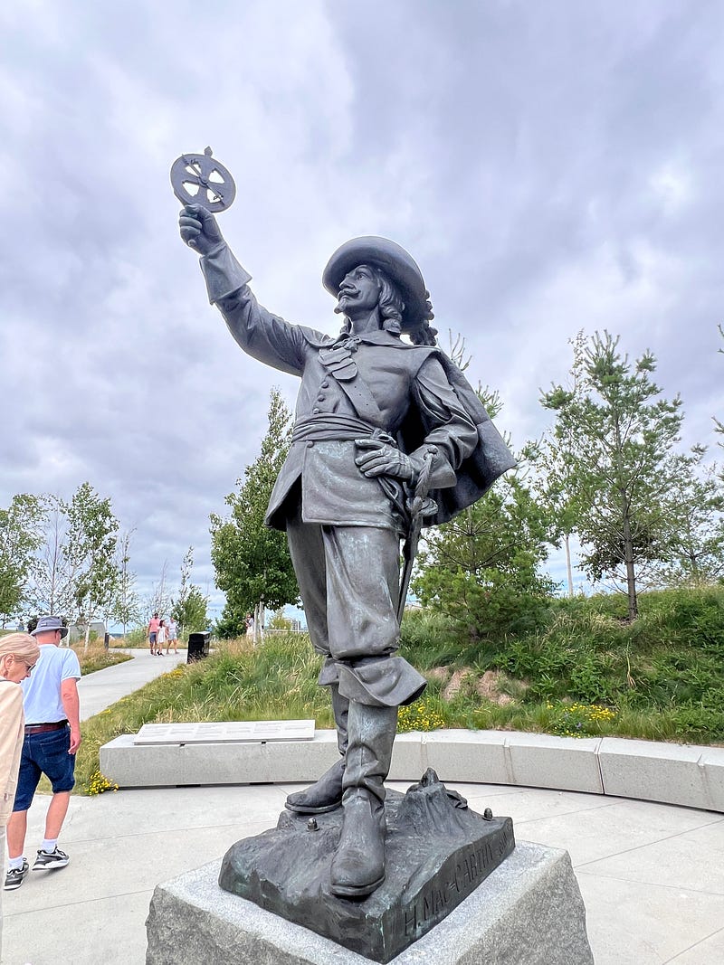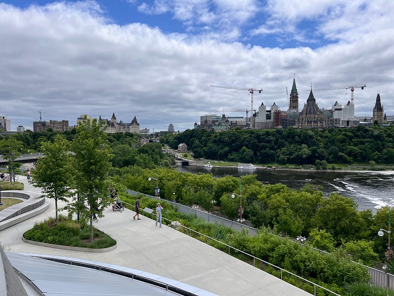 On the opposite side of the hill, the redevelopment of Nepean Point is visible. Once home to a prominent monument dedicated to the explorer Samuel D. Champlain, it has now been transformed into "Kìwekì," meaning "lookout" in Algonquin, to honour Indigenous heritage. The National Capital Commission (NCC) has revamped the site, which was not very inviting for visitors, to enhance the experience while maintaining its historical significance. The statue has been somewhat demoted from its summit position, and the new Kìwekì now provides a welcoming space for residents and tourists alike, celebrating Indigenous contributions and fostering community connections. They’ve done a really great redevelopment here and well worth a visit on a sunny blue sky day.