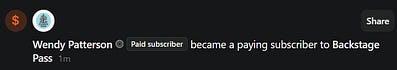 Thank you so much, Wendy Patterson, you are Paid subscriber #54 for Backstage Pass! Appreciate you, the Paid community is a wonderfully supportive group!
