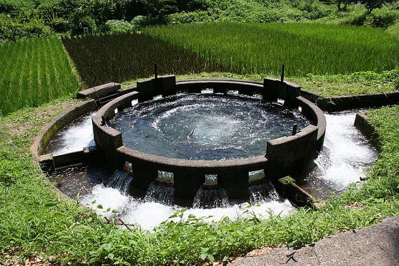 The development of the Entobunsui circular water divider in early 20th-century Japan can be seen as a way of stabilising usufructuary rights through technological design. A common characteristic of a right of usufruct is use of and benefit from a resource without wasting it. In agrarian societies, irrigation water is typically not owned outright by individuals but shared among communities, with each farmer holding a right to use a portion for cultivation. It is the norm not to waste water. As well water supply can be variable, is rivalrous (one person’s use reduces what is available), and may be difficult to measure without flow meters, gauges and monitoring systems. This makes equitable allocation both legally and practically complex.