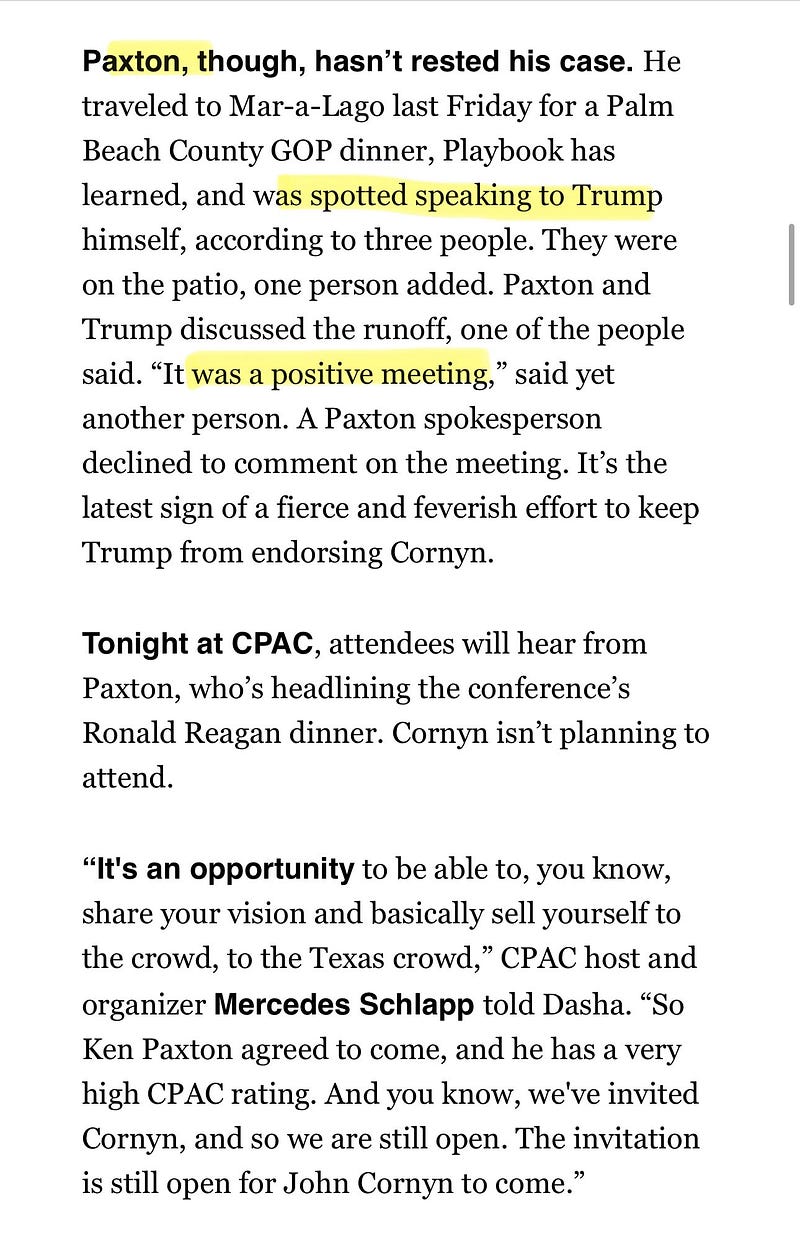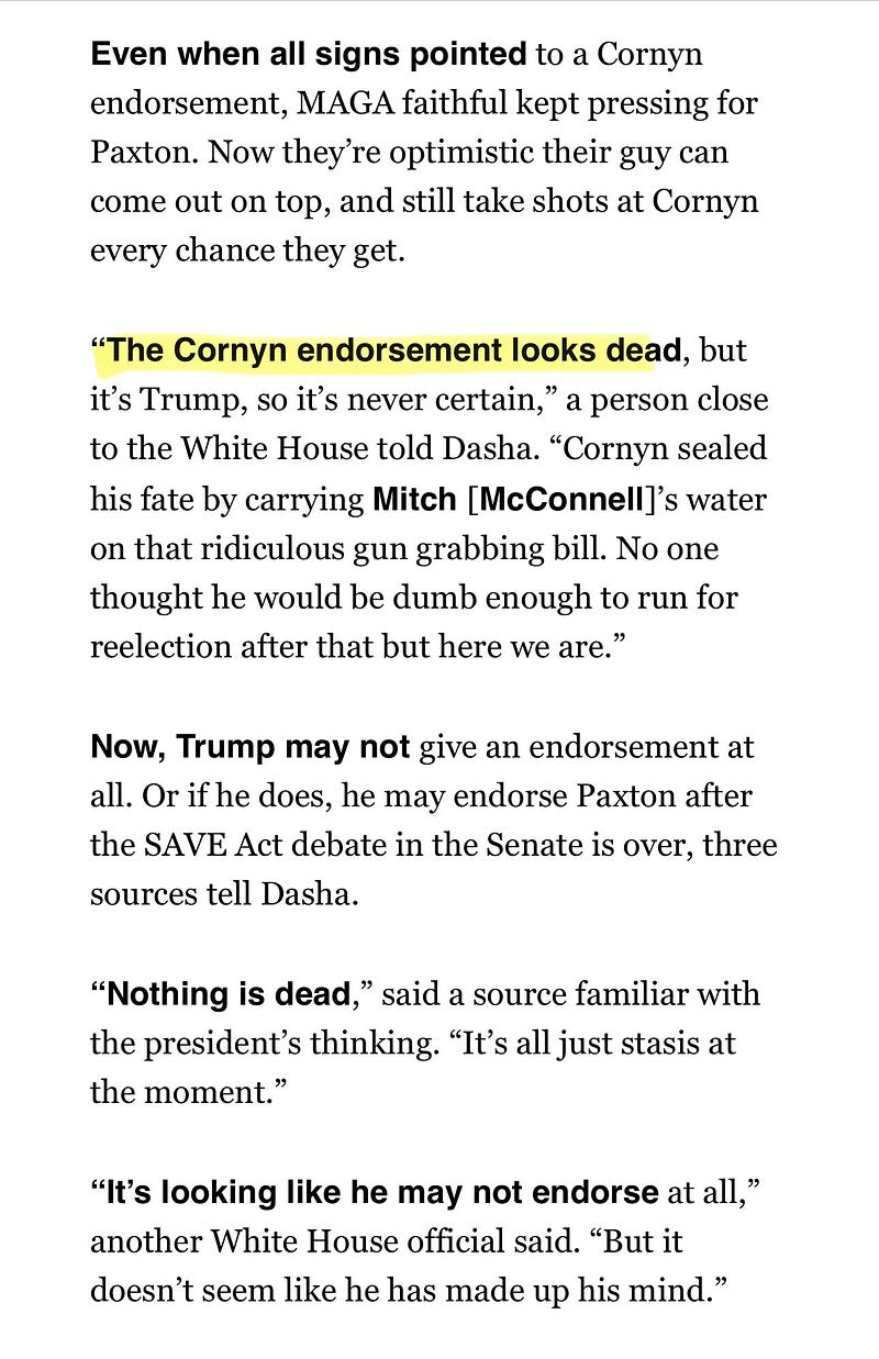 According to Politico, Ken Paxton has met with Trump and he won’t endorse Cornyn, but he might endorse Paxton