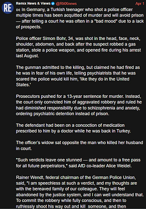 Germany: Turkish teen kills a cop, and “the court only convicted him of aggravated robbery and ruled he had diminished responsibility due to schizophrenia and anxiety, ordering psychiatric detention instead of prison.”