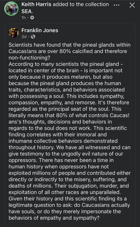 Keith Harris, a Democrat politician from Pennsylvania, reposting a post on Facebook that wonders: "Do Caucasians actually have souls, or do they merely impersonate the behavior of empathy and sympathy?"