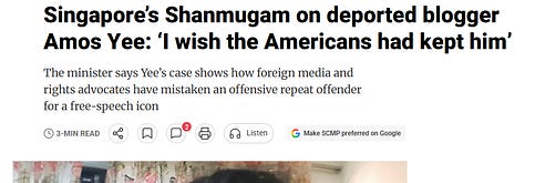 Singapore’s Home Affairs Minister K. Shanmugam has said he wished the United States had kept controversial blogger and child sex convict Amos Yee, warning that foreign media and rights advocates have mistaken a repeat offender, who was deported back to the city state, for a free-speech icon.
