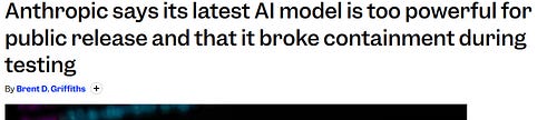 If anyone is wondering how AI development is going: “Anthropic says its latest AI model is too powerful for public release and that it broke containment during testing”