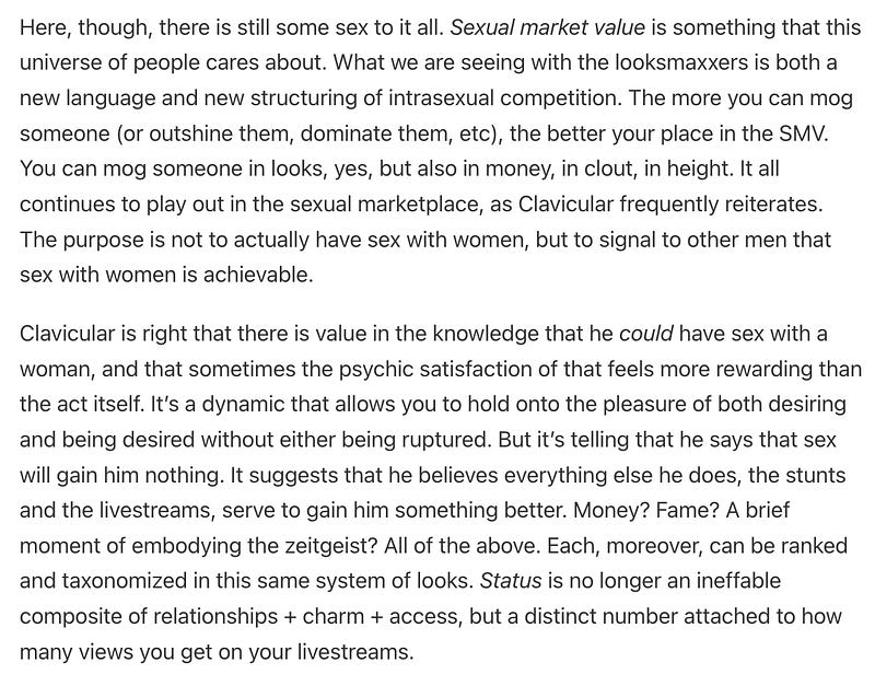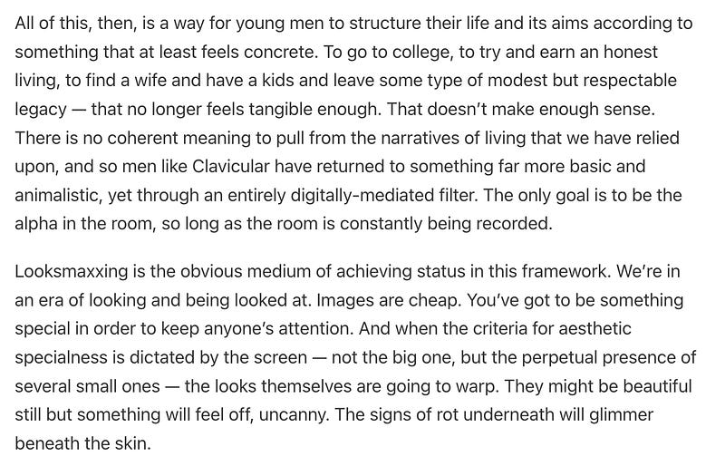 Maybe the world doesn’t need more thinkpieces on Clavicular and the flamboyant nihilism of looksmaxxing, but I also see it as something we must constantly, repeatedly, unashamedly confront and interrogate. So, here’s me.