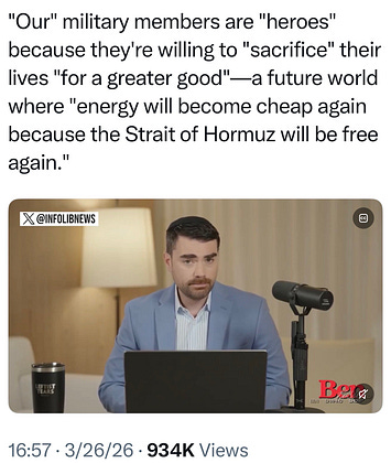 Now he is advocating for OTHER American men & woman to go die in Iran for so he can make money off his podcast for the CPAC-Grindr believers.