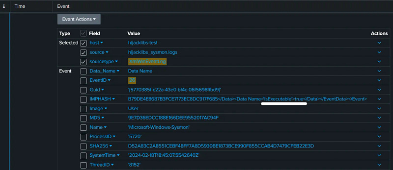 Sysmon flags all four DLLs with IsExecutable set to true. This event gets tuned out on most teams because it is noisy, but IsExecutable=true on files sitting in %TEMP% is not noise. It is confirmation that these are not passive data files. They contain code that is about to run.
