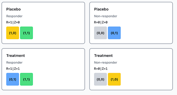 In practice, you cannot use data from a standard RCT to classify patients into these 4 buckets because we only ever observe outcome under placebo, R(0) or outcome under treatment R(1) but never both at the same time.