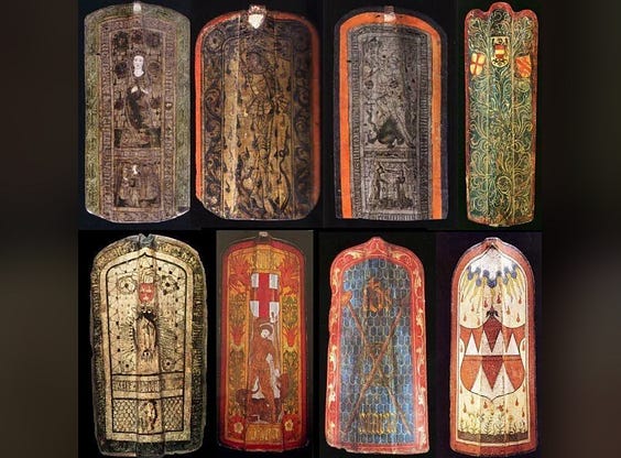 These are pavise shields used in the European Middle Ages, often to protect bowmen from enemy arrows. Note the intricate decoration. Always intrigued by the attention to detail these people paid to the look and feel of their equipment, one that is probably unmatched in military history.