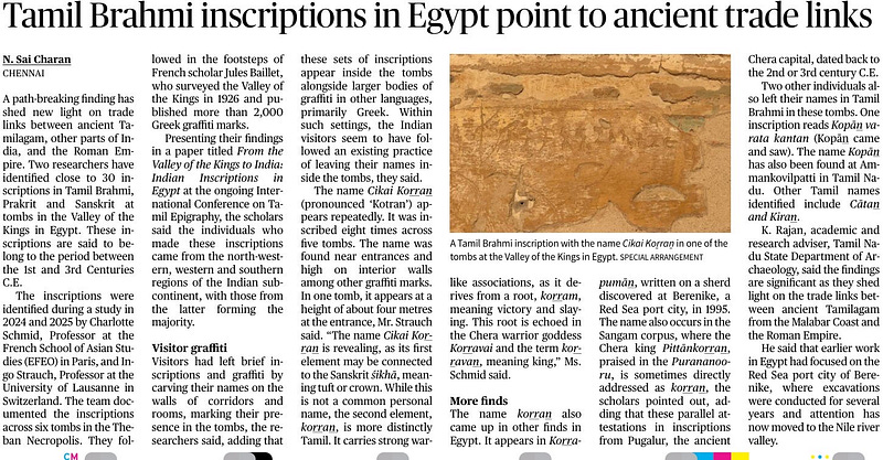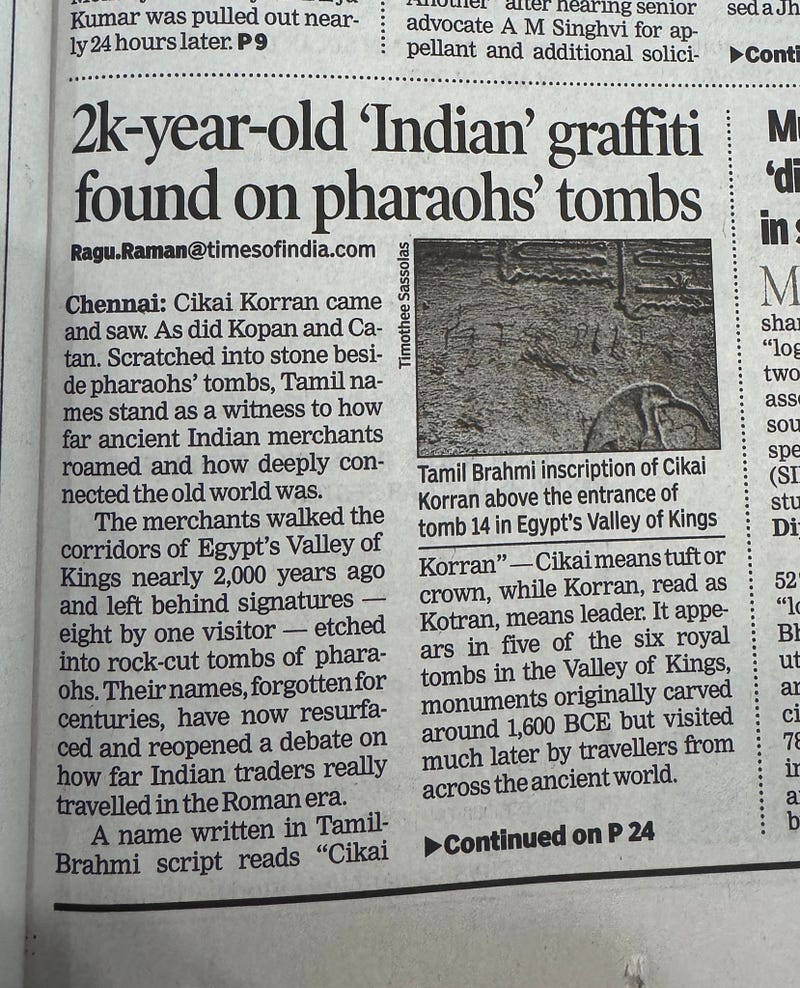 This is incredible! About 30 Tamil Brahmi inscriptions were found on Ancient Egyptian Tombs in the Valley of the Kings! What’s very significant and fascinating are the words that are found; words such as “Cikai Korran”, which could mean crown and leader, which can give us a lot more insight on the kind influence these Tamil merchants (and vice-versa) may have had on language, and perhaps political systems.