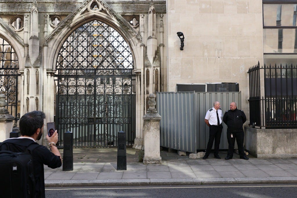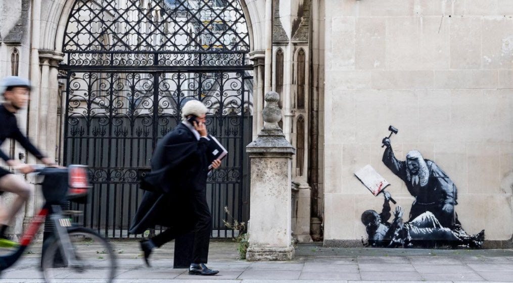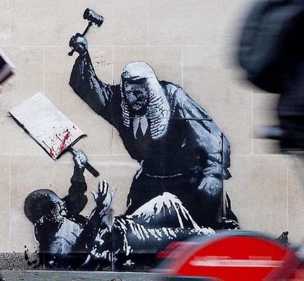 Op de gevel van de Royal Courts of Justice in Londen verscheen dit weekend een nieuw werk van #Banksy: een rechter die, gewapend met zijn hamer, een demonstrant tegen de grond slaat. Het beeld is rauw, confronterend en tot op het bot politiek. Niet toevallig dook het op in een week waarin bijna 900 activisten werden opgepakt na protesten tegen het Britse verbod op de groep Palestine Action.