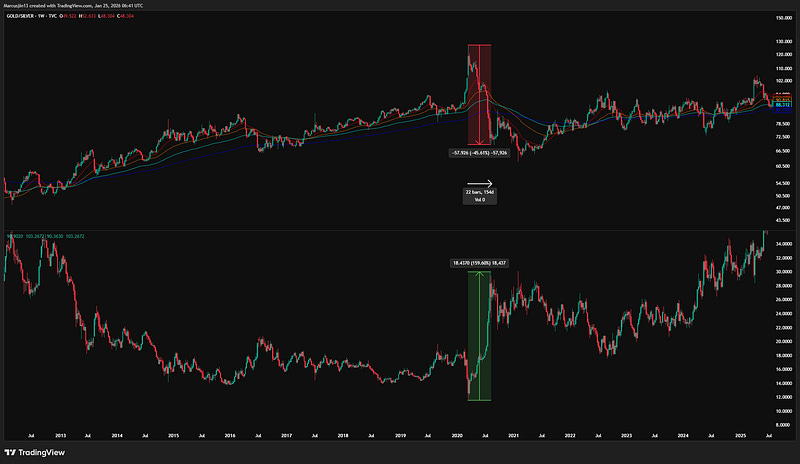 按照過去 50 年反覆驗證過的歷史規律,一旦 Gold / Silver 比值正式反轉,我們極有可能再次看到 黃金與白銀同步出現大幅修正。
