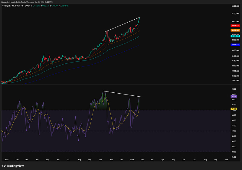 從歷史來看,這種組合幾乎都是一個非常典型的週期末端警訊。每一次出現這種結構,黃金都會在不久後見頂,接著迎來一波幅度不小的修正。而修正的強度,通常取決於前面上漲的速度與幅度——漲得越猛,之後跌得就越狠。