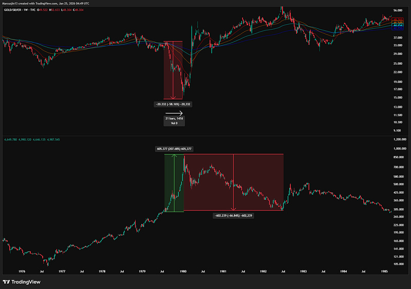 這是一個教科書等級的黃金拋物線頂部。短短五個月內,黃金上漲約 200%,同一時間白銀則大幅跑贏黃金。當這段行情結束後,黃金回落接近 70%,而白銀最終下跌約 90%。