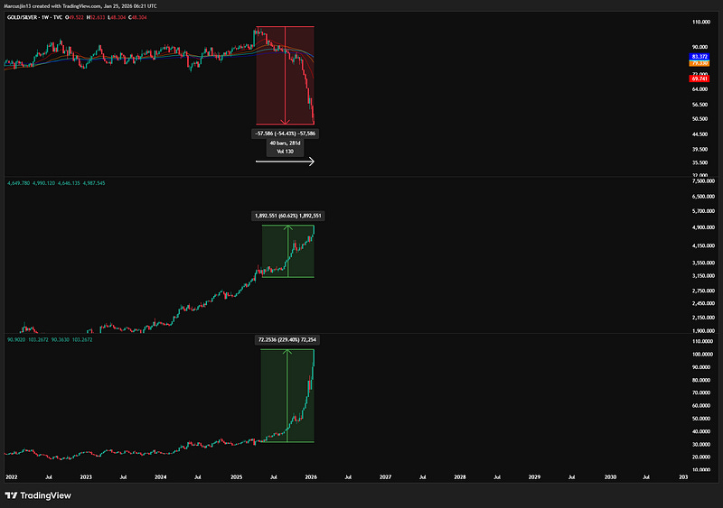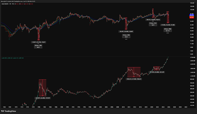 類似的結構再次出現。黃金進入末端加速段,白銀明顯跑贏。當 黃金 / 白銀 比值開始反轉後,整個過程大約持續 35 週 左右,隨後白銀出現 超過 70% 的跌幅。