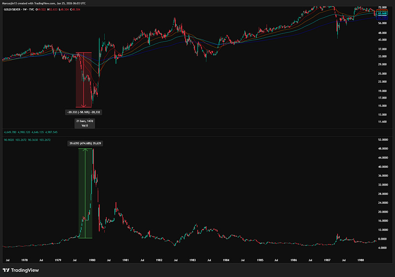 第一張圖表上半部是 黃金 / 白銀 比值(用白銀計價的黃金),時間週期是 週線,涵蓋從 1970 年代至今的數據。