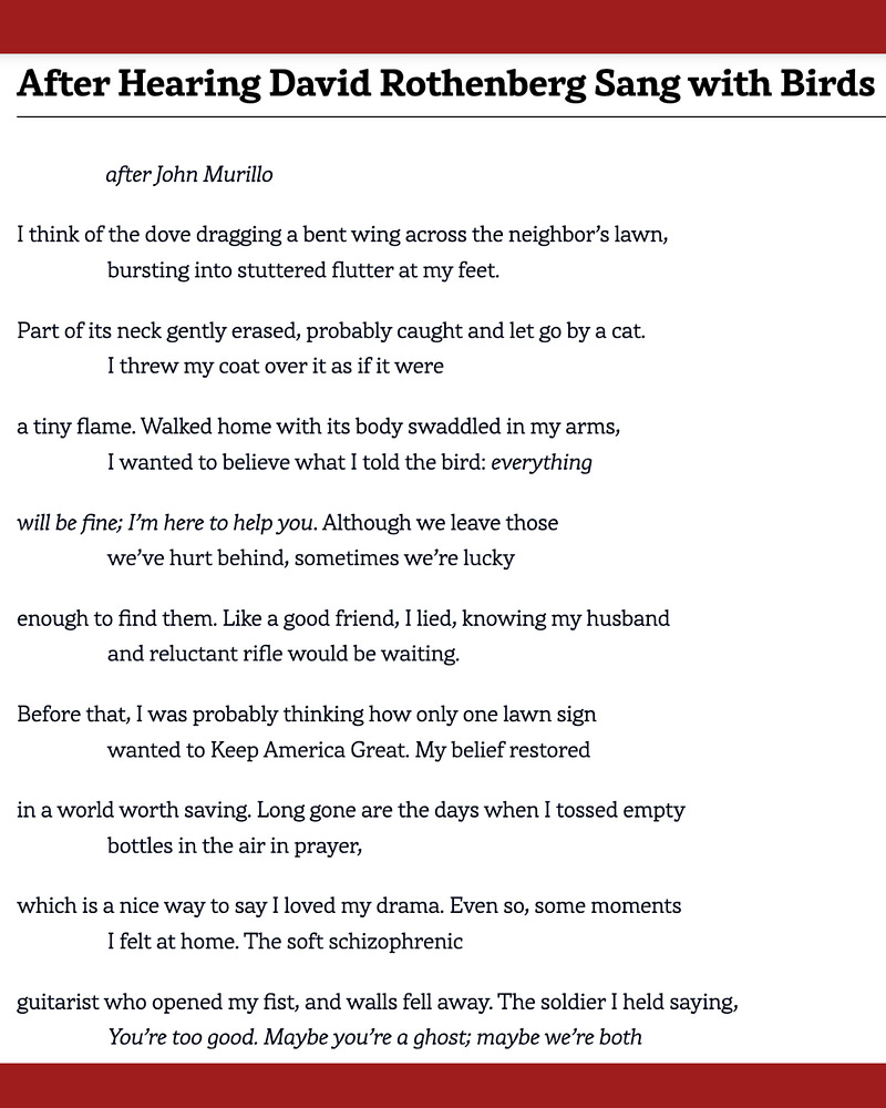 Thank you so much to Jeremy Schraffenberger and the editorial team at The North America Review for publishing my new poem, "After Hearing David Rothenberg Sang with Birds." The team has supported me so much over the years, and several of the poems from PULSE originally appeared in their esteemed pages.