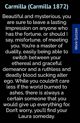 I took a quiz to know which fictional vampire I am because that's what you do when you're 30 and unemployed obviously, and it looks like I get to live another day because I got CARMILLA HOW FUCKING COOL IS THAT