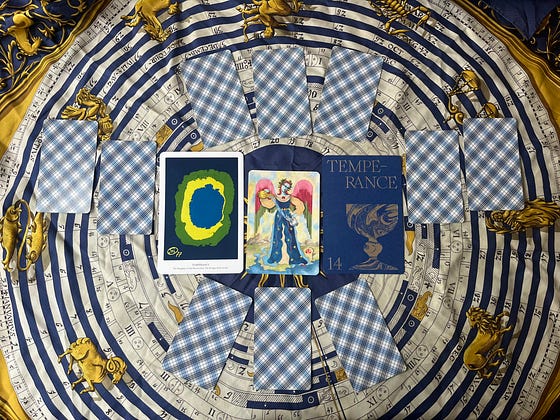 3 decks at the center with different depictions of the Temperance card for a client: Ithell Colquhoun, taro as colour/ the Camena Tarot by Lou Benesch and Laetitia Barbier/the anOther tarot by Mathilde Moriniere