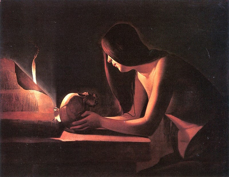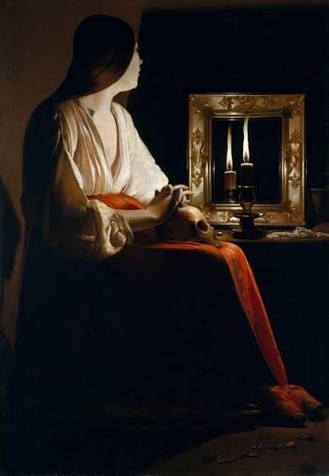 Georges de La Tour painted multiple versions of Mary Magdalene across the 1630s and 40s, always coming back to the same sparse arrangement: a candle, a skull, a mirror, a body seated in stillness, turned inward. De La Tour was a chiaroscuro magician, chiaro (light) and oscuro (dark). The flame lights her face and a bit of her body while the rest recedes into a dense, velvety darkness. The light is small and contained yet it gathers the entire scene around it and holds it right there for us to witness. The shadow holds it too, gathering the edges, keeping the scene from spilling, giving depth and weight to what the light reveals. They work together 🌓 It is magnificent. When I think of a mastery of balancing light and shadow, I think of these paintings. (I am writing a longer juicier substack piece about this)