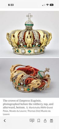 You’d think the Louvre would have the best restorers on speed dial. But they don't. The museum is holding an open call for restorers to submit proposals to repair the crushed crown of Empress Eugénie, which the thieves dropped while fleeing.