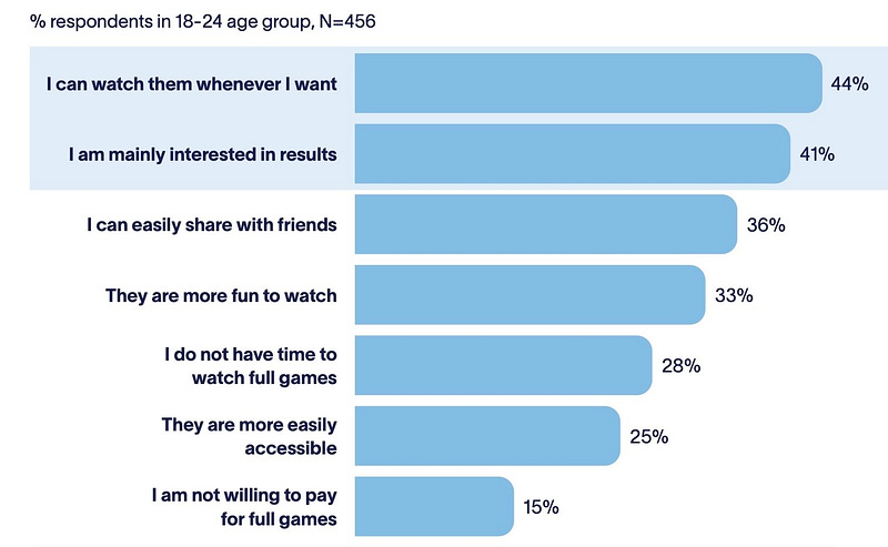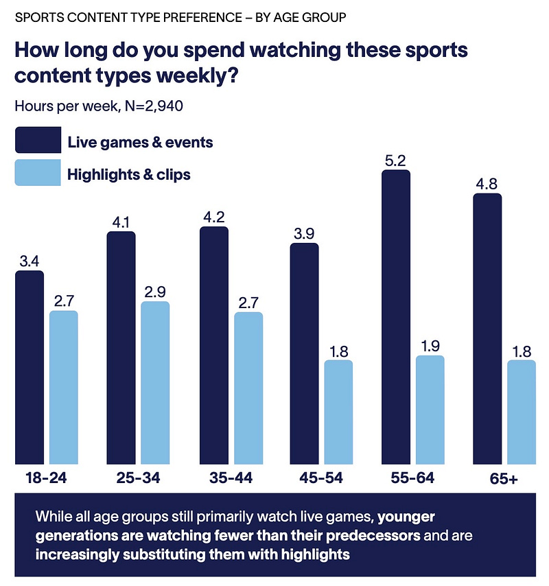 Research from Altman Solon shows that for audiences under 45, time spent on watching sports clips and highlights can rival live viewing hours, nearing three hours per week.