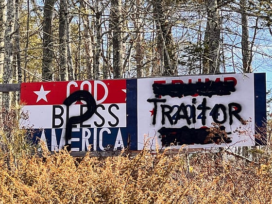 These signs were set up at the top of a road cut on Rt#1 in Woolwich Maine. It announced “Trump 2024 MAGA to millions of tourists to Vacation Land as they made their way North along this scenic mid-coast area.