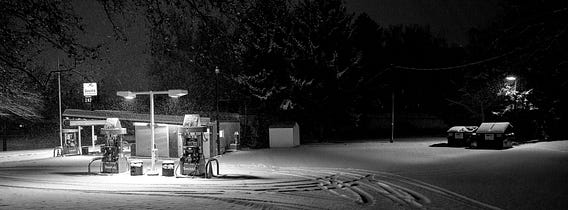 It was Christmas Eve and all had gone quiet as the snow accumulated. We went for a walk. Few others were out. Actually, we might not have seen anyone else, only the tire tracks or their footprints in the snow. A friend later saw this image and declared, “That’s some Edward Hopper shit right there.” I nodded like I knew who that was. Of course, when I looked him up I rediscovered “Nighthawks” and understood the art we may experience in the mundane.