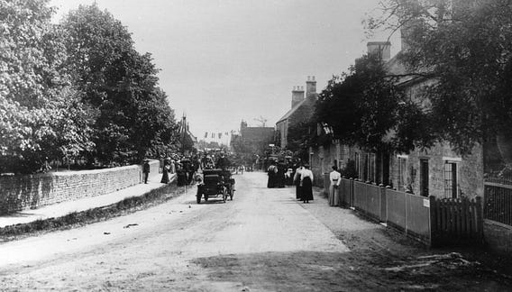 Someone posted a 1909 postcard in our old village Facebook group! This was our house on the right [well, most of it; the part that is thatched here got burned down in a village-boys-with-fireworks incident (one of those boys was later my elderly handyman; the other one owned the village shop) and then rebuilt with more Collyweston stone].