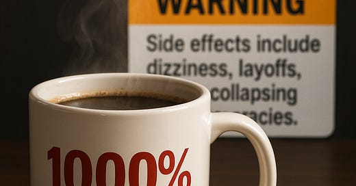 The “America First” façade is cracking faster than Milei’s voice at his Buenos Aires rock concert. This week, Trump unveiled his new miracle cure, trumprx.gov, promising drug discounts of “a thousand percent” while quietly axing thousands of federal workers. Meanwhile, the Treasury is bailing out Argentina’s leather-clad libertarian with $20 billion in taxpayer cash, and Qatar is building an airbase in Idaho.
