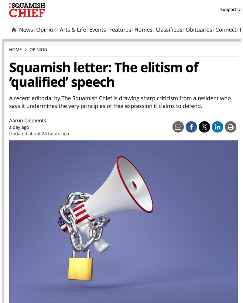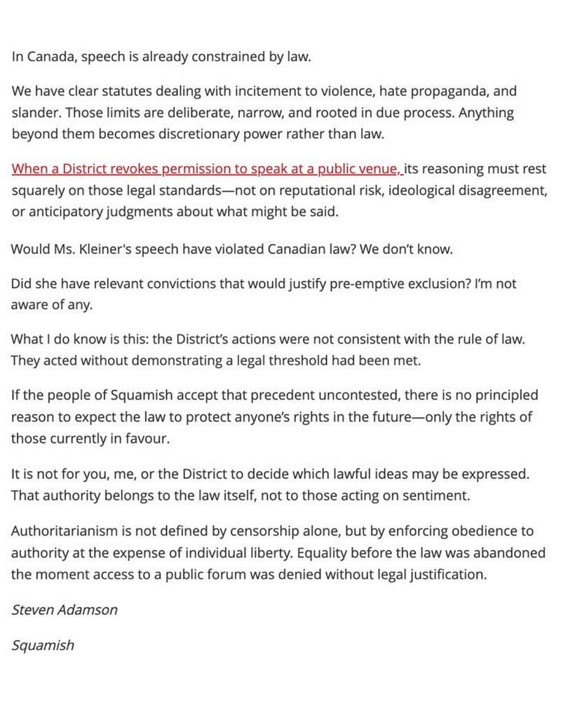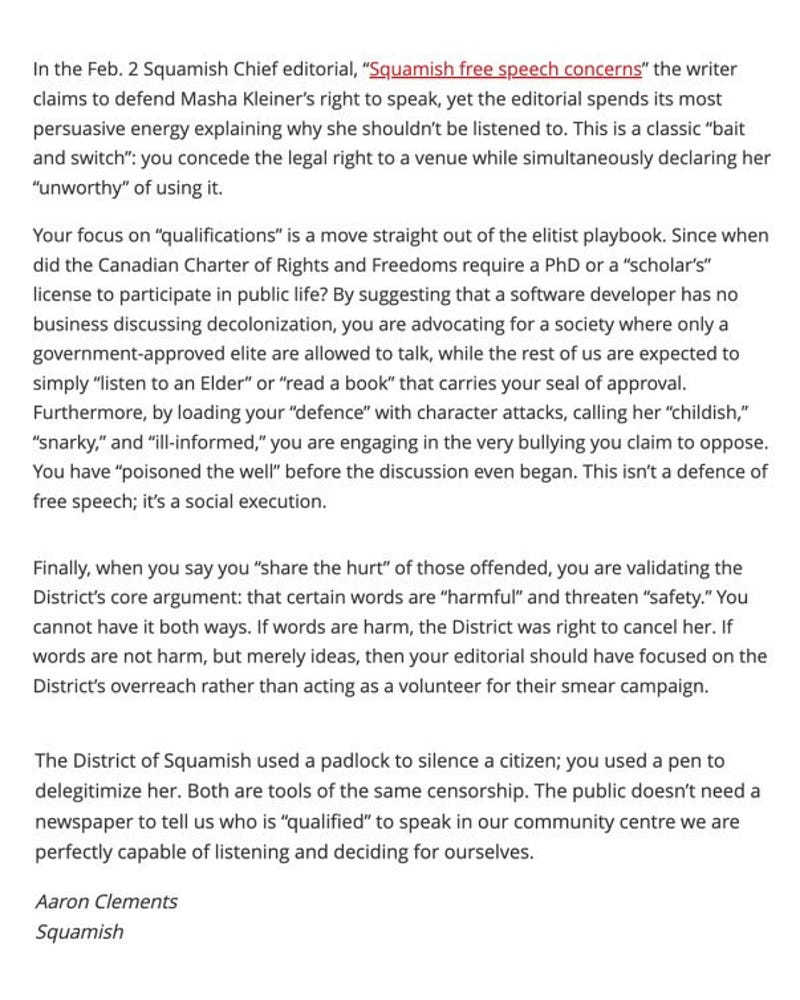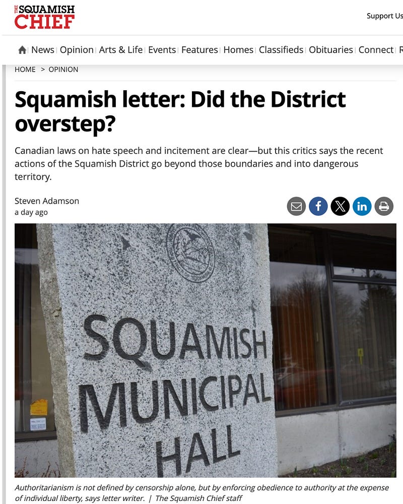 I couldn't be more grateful to these Squamish residents who put their names on the line to defend my right to free speech. We don't know each other; maybe our views are different, and possibly we disagree on most things. It doesn't matter. Freedom of speech is fundamental to all other freedoms in society.