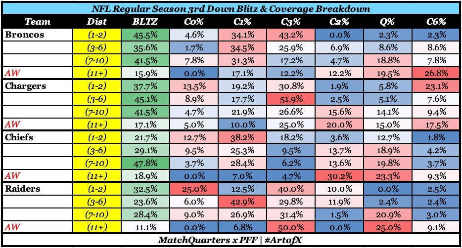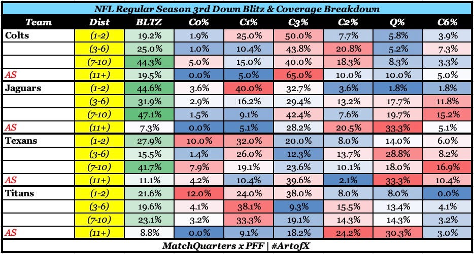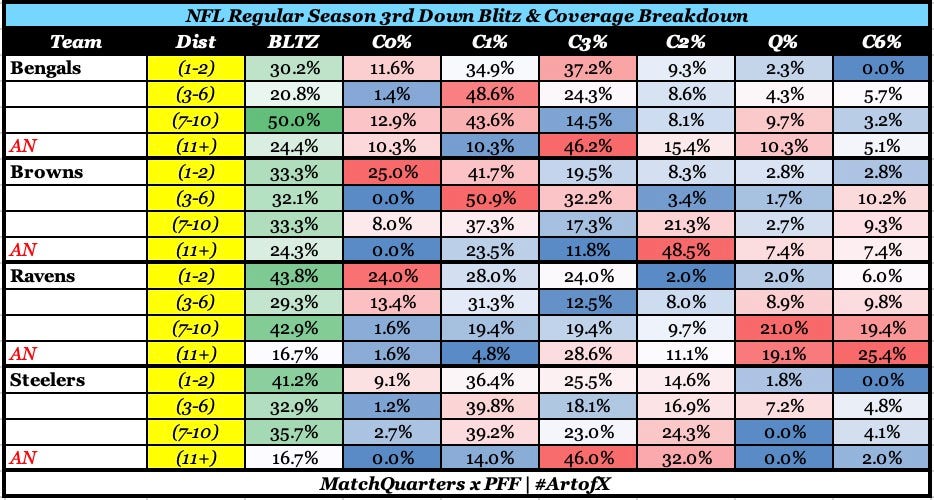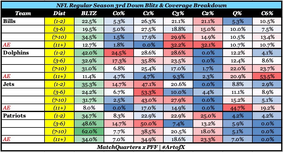 AFC Regular Season 3rd Down Blitz & Coverage Rates