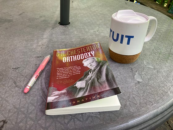 Plodding my way through Orthodoxy, because I have to step away frequently to take it all in, and go back to it when I can pay close attention. GKC quote of the day: