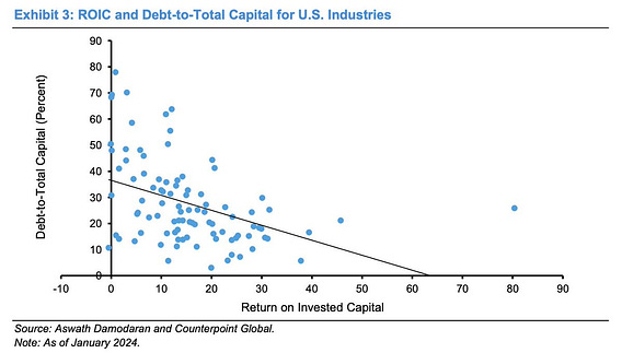 "Industries with high ROICs tend to have lower debt-to-total capital ratios and those with low ROICs have higher ratios"