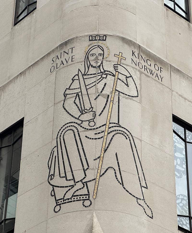 This is St Olave as depicted on his namesake building in Southwark. Olave was King of Norway, dedicatee of several London churches, destroyer of London Bridge and… inventor of the skateboard? The king-saint is often shown with his foot on unlikely objects. The second pic (Melissa Highton, creative commons) depicts our man in Orkney Cathedral, resting his foot on some kind of regal man-beast. Probably never happened.