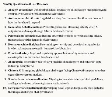 A group of Chinese legal scholars just put out the “Ten Big Questions in AI Law Research.” Below is a Claude translation (and slight condensation) of the questions. Some quick thoughts: