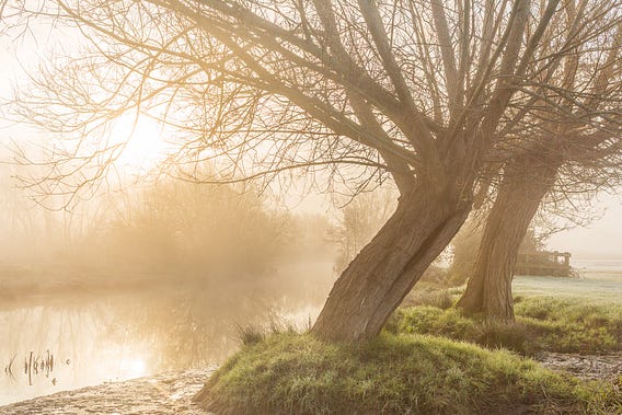 An ethereal moment on the banks of the River Stour at Flatford. Just as the sun rose the light started to reflect through the mist and over the surface of the water.