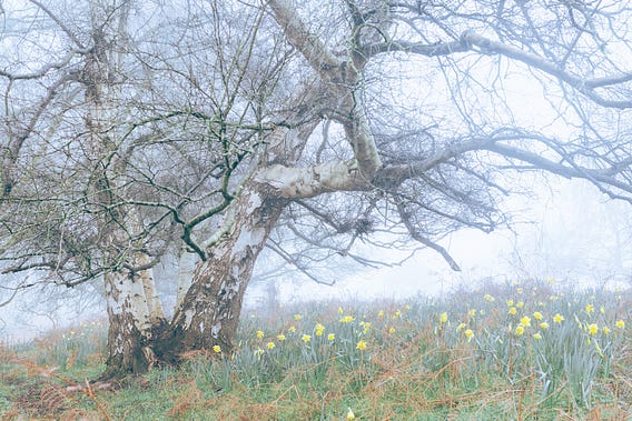 Daffodils and silvers birches, surrounded by a thick mist. Shot on a magical morning in the woods.