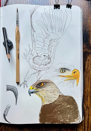 Filling the page: Eagle taking flight in sepia ink. In February 2019, after a weekend-long oyster conference in New Orleans, I gave myself the morning before flying back to KY to explore the Central Arts District. Fact: I knew I was sick, but I wouldn't know my stage IV liposarcoma diagnosis for two more months. Anyway, David Yarrow had an exhibit, “Wild Encounters” (I didn't note the gallery name): gorgeous, wall-filling wildlife and nature photography, all done in a sepia/silvertone. I'm sure there's a proper term for that style in photography. Drop me a note if you know. Eagle head in graphite and watercolor. Thanks to French photographer Tof Mayanoff on Unsplash for the photo study. You might've seen my Cooper’s Hawk bust rendition with the gold foils and watercolor in a previous Note. Practicing talons in 2B graphite and watercolor because bird feet are hard. We can do hard things! 🔥