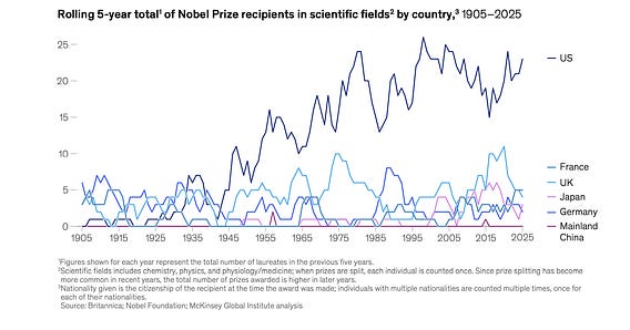 “Between 1940 and 2020, approximately 27 percent of United States–based Nobel Prizes in science went to winners born outside the United States.“