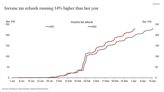 "We are in the middle of tax filing season, and the latest weekly data from the Treasury shows that refunds for households are currently running at a rate that is 14% higher than last year." (Source: Apollo)