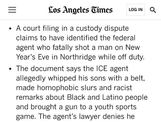 The off-duty ICE agent who killed Keith Porter in LA has been identified as Brian Palacios. He was accused in previous court filings of child abuse and making racist and homophobic remarks. He remains free and has not been charged, of course.