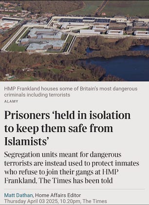A Times investigation has revealed that Muslim extremists have ‘seized control of entire wings’ in many prisons in Britain. Segregation units intended to isolate terrorists are instead allegedly being used to house inmates who refuse to join Islamist gangs, as it’s the only way to ensure those inmates aren’t beaten up or killed by the Islamists (who should be the ones being housed in those units). Sharia courts have been set up inside. Religious rules are enforced with floggings and violence. Etc. And, of course, staff are reluctant to intervene for fear of being labelled Islamophobic.